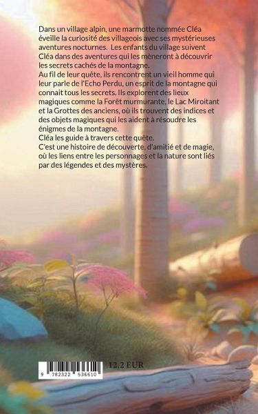 Dans un village alpin, une marmotte nommée Cléa éveille la curiosité des villageois avec ses mystérieuses aventures nocturnes. Les enfants du village suivent Cléa dans des aventures qui les mèneront à découvrir les secrets cachés de la montagne.Au fil de leur quête, ils rencontrent un vieil homme qui leur parle de l'Echo Perdu, un esprit de la montagne qui connait tous les secrets. Ils explorent des lieux magiques comme la Forêt murmurante, le Lac Miroitant et la Grottes des anciens, où ils trouvent des indices et des objets magiques qui les aident à résoudre les énigmes de la montagne.Cléa les guide à travers cette quête.C'est une histoire de découverte, d'amitié et de magie, où les liens entre les personnages et la nature sont liés par des légendes et des mystères.