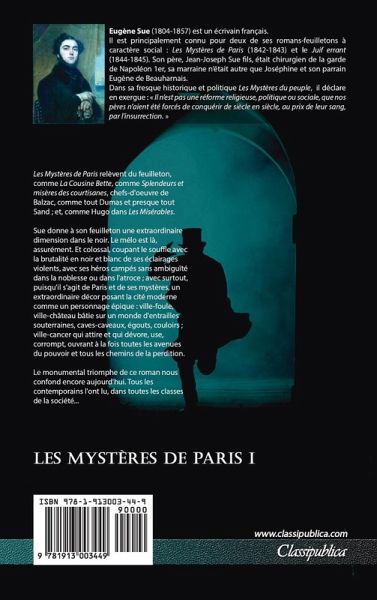 Les Mystères de Paris relèvent du feuilleton, comme La Cousine Bette, comme Splendeurs et misères des courtisanes, chefs-d'oeuvre de Balzac, comme tout Dumas et presque tout Sand ; et, comme Hugo dans Les Misérables. Sue donne à son feuilleton une extraordinaire dimension dans le noir. Le mélo est là, assurément. Et colossal, coupant le souffle avec la brutalité en noir et blanc de ses éclairages violents, avec ses héros campés sans ambiguïté dans la noblesse ou dans l'atroce ; avec surtout, puisqu'il s'agit de Paris et de ses mystères, un extraordinaire décor posant la cité moderne comme un personnage épique : ville-foule, ville-château bâtie sur un monde d'entrailles souterraines, caves-caveaux, égouts, couloirs ; ville-cancer qui attire et qui dévore, use, corrompt, ouvrant à la fois toutes les avenues du pouvoir et tous les chemins de la perdition. Le monumental triomphe de ce roman nous confond encore aujourd'hui. Tous les contemporains l'ont lu, dans toutes les classes de la société...