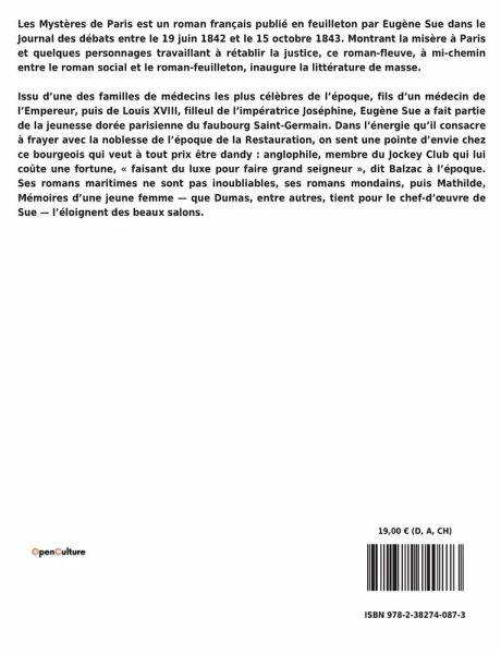 Les Mystères de Paris est un roman français publié en feuilleton par Eugène Sue dans le Journal des débats entre le 19 juin 1842 et le 15 octobre 1843. Montrant la misère à Paris et quelques personnages travaillant à rétablir la justice, ce roman-fleuve, à mi-chemin entre le roman social et le roman-feuilleton, inaugure la littérature de masse. Issu d¿une des familles de médecins les plus célèbres de l¿époque, fils d¿un médecin de l¿Empereur, puis de Louis XVIII, filleul de l¿impératrice Joséphine, Eugène Sue a fait partie de la jeunesse dorée parisienne du faubourg Saint-Germain. Dans l¿énergie qüil consacre à frayer avec la noblesse de l¿époque de la Restauration, on sent une pointe d¿envie chez ce bourgeois qui veut à tout prix être dandy : anglophile, membre du Jockey Club qui lui coûte une fortune, « faisant du luxe pour faire grand seigneur », dit Balzac à l¿époque. Ses romans maritimes ne sont pas inoubliables, ses romans mondains, puis Mathilde, Mémoires d¿une jeune femme ¿ que Dumas, entre autres, tient pour le chef-d¿¿uvre de Sue ¿ l¿éloignent des beaux salons.