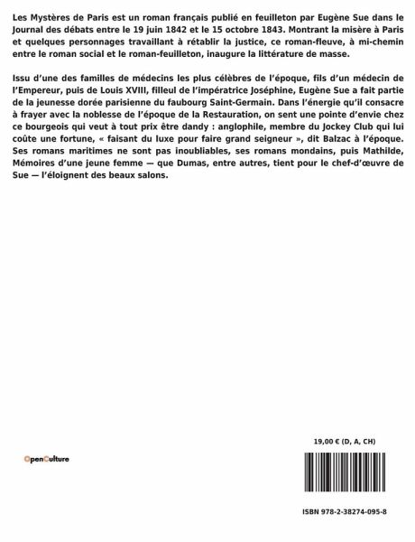 Les Mystères de Paris est un roman français publié en feuilleton par Eugène Sue dans le Journal des débats entre le 19 juin 1842 et le 15 octobre 1843. Montrant la misère à Paris et quelques personnages travaillant à rétablir la justice, ce roman-fleuve, à mi-chemin entre le roman social et le roman-feuilleton, inaugure la littérature de masse. Issu d¿une des familles de médecins les plus célèbres de l¿époque, fils d¿un médecin de l¿Empereur, puis de Louis XVIII, filleul de l¿impératrice Joséphine, Eugène Sue a fait partie de la jeunesse dorée parisienne du faubourg Saint-Germain. Dans l¿énergie qüil consacre à frayer avec la noblesse de l¿époque de la Restauration, on sent une pointe d¿envie chez ce bourgeois qui veut à tout prix être dandy : anglophile, membre du Jockey Club qui lui coûte une fortune, « faisant du luxe pour faire grand seigneur », dit Balzac à l¿époque. Ses romans maritimes ne sont pas inoubliables, ses romans mondains, puis Mathilde, Mémoires d¿une jeune femme ¿ que Dumas, entre autres, tient pour le chef-d¿¿uvre de Sue ¿ l¿éloignent des beaux salons.