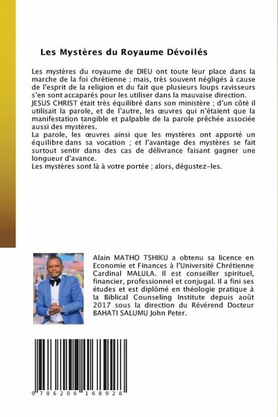 Les mystères du royaume de DIEU ont toute leur place dans la marche de la foi chrétienne ; mais, très souvent négligés à cause de l'esprit de la religion et du fait que plusieurs loups ravisseurs s'en sont accaparés pour les utiliser dans la mauvaise direction.JESUS CHRIST était très équilibré dans son ministère ; d'un côté il utilisait la parole, et de l'autre, les oeuvres qui n'étaient que la manifestation tangible et palpable de la parole prêchée associée aussi des mystères.La parole, les oeuvres ainsi que les mystères ont apporté un équilibre dans sa vocation ; et l'avantage des mystères se fait surtout sentir dans des cas de délivrance faisant gagner une longueur d'avance.Les mystères sont là à votre portée ; alors, dégustez-les.
