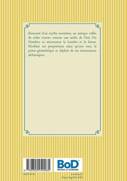 Remonté d'un mythe sumérien, un antique coffre de cèdre s'ouvre comme une arche de Noé. Du Nombre, se structurent la lumière et la forme. Révélant ses proportions ainsi qu'une rose, la pierre géométrique se déploie de ses résonnances alchimiques.