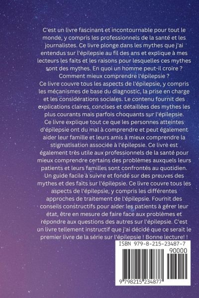 Il s'agit d'un livre captivant et incontournable pour tous, y compris les professionnels de la santé et les journalistes. Ce livre plonge dans les mythes que j'ai entendus au fil des ans sur l'épilepsie et donne à mes lecteurs une explication des faits et des raisons pour lesquelles les mythes sont des mythes. Que peut croire une personne ? Comment mieux comprendre l'épilepsie ? Ce livre couvre tous les aspects de l'épilepsie, y compris les mécanismes de base pour le diagnostic et la gestion et les considérations sociales. Le contenu fournit une explication claire, concise et détaillée des mythes les plus courants, mais parfois choquants, sur l'épilepsie. Ce livre explique tout ce que les personnes atteintes d'épilepsie ont du mal à comprendre et peut également aider leur famille et leurs amis à mieux comprendre les stigmates associés à l'épilepsie. Ce livre peut également être extrêmement utile aux professionnels de la santé pour mieux comprendre certains des problèmes auxquels leurs patients et leurs familles sont confrontés au quotidien. Il s'agit d'un guide facile à comprendre, fondé sur des preuves, des mythes et des faits sur l'épilepsie. Ce livre contient plusieurs aspects de l'épilepsie et comprend différentes méthodes de traitement de l'épilepsie. Des conseils constructifs sont donnés pour aider les personnes atteintes à gérer leur état et à être en mesure de faire face aux problèmes et de répondre aux questions des autres sur l'épilepsie. C'est un livre très instructif et j'ai donc décidé qu'il serait le premier de la série sur l'épilepsie à être publié ! Bonne lecture!!