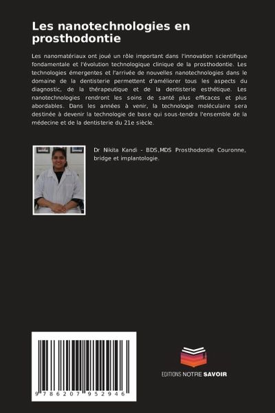 Les nanomatériaux ont joué un rôle important dans l'innovation scientifique fondamentale et l'évolution technologique clinique de la prosthodontie. Les technologies émergentes et l'arrivée de nouvelles nanotechnologies dans le domaine de la dentisterie permettent d'améliorer tous les aspects du diagnostic, de la thérapeutique et de la dentisterie esthétique. Les nanotechnologies rendront les soins de santé plus efficaces et plus abordables. Dans les années à venir, la technologie moléculaire sera destinée à devenir la technologie de base qui sous-tendra l'ensemble de la médecine et de la dentisterie du 21e siècle.