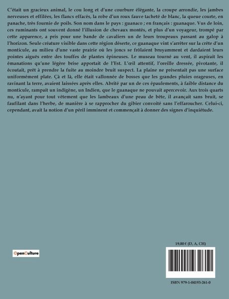C¿était un gracieux animal, le cou long et d¿une courbure élégante, la croupe arrondie, les jambes nerveuses et effilées, les flancs effacés, la robe d¿un roux fauve tacheté de blanc, la queue courte, en panache, très fournie de poils. Son nom dans le pays : guanaco ; en français : guanaque. Vus de loin, ces ruminants ont souvent donné l¿illusion de chevaux montés, et plus d¿un voyageur, trompé par cette apparence, a pris pour une bande de cavaliers un de leurs troupeaux passant au galop à l¿horizon. Seule créature visible dans cette région déserte, ce guanaque vint s¿arrêter sur la crête d¿un monticule, au milieu d¿une vaste prairie où les joncs se frôlaient bruyamment et dardaient leurs pointes aiguës entre des touffes de plantes épineuses. Le museau tourné au vent, il aspirait les émanations qüune légère brise apportait de l¿Est. L¿¿il attentif, l¿oreille dressée, pivotante, il écoutait, prêt à prendre la fuite au moindre bruit suspect. La plaine ne présentait pas une surface uniformément plate. Çà et là, elle était vallonnée de bosses que les grandes pluies orageuses, en ravinant la terre, avaient laissées après elles. Abrité par un de ces épaulements, à faible distance du monticule, rampait un indigène, un Indien, que le guanaque ne pouvait apercevoir. Aux trois quarts nu, n¿ayant pour tout vêtement que les lambeaux d¿une peau de bête, il avançait sans bruit, se faufilant dans l¿herbe, de manière à se rapprocher du gibier convoité sans l¿effaroucher. Celui-ci, cependant, avait la notion d¿un péril imminent et commençait à donner des signes d¿inquiétude.