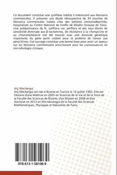 Ce document constitue une synthèse inédite s'intéressant aux Neisseria commensales. Il présente une étude rétrospective de 34 souches de Neisseria commensales isolées chez des patients immunodéprimés, hospitalisés au Centre National de Greffe de Moelle Osseuse de Tunis. Une prédominance de N. subflava var. perflava et des taux élevés de sensibilité diminuée aux beta-lactamines, de résistance à la rifampicine et au chloramphénicol ont été trouvés avec une diversité génétique importante du gène penA codant pour la protéine de liaison aux pénicillines. Cet ouvrage constitue une bonne base pour avoir un aperçu sur les Neisseria commensales enrichissant ainsi les connaissances en microbiologie clinique.