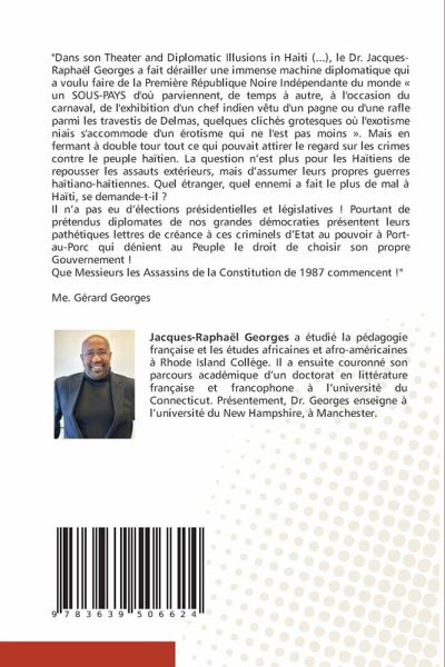 "Dans son Theater and Diplomatic Illusions in Haiti (...), le Dr. Jacques-Raphaël Georges a fait dérailler une immense machine diplomatique qui a voulu faire de la Première République Noire Indépendante du monde « un SOUS-PAYS d'où parviennent, de temps à autre, à l'occasion du carnaval, de l'exhibition d'un chef indien vêtu d'un pagne ou d'une rafle parmi les travestis de Delmas, quelques clichés grotesques où l'exotisme niais s'accommode d'un érotisme qui ne l'est pas moins ». Mais en fermant à double tour tout ce qui pouvait attirer le regard sur les crimes contre le peuple haïtien. La question n'est plus pour les Haïtiens de repousser les assauts extérieurs, mais d'assumer leurs propres guerres haïtiano-haïtiennes. Quel étranger, quel ennemi a fait le plus de mal à Haïti, se demande-t-il ?Il n'a pas eu d'élections présidentielles et législatives ! Pourtant de prétendus diplomates de nos grandes démocraties présentent leurs pathétiques lettres de créance à ces criminels d'Etat au pouvoir à Port-au-Porc qui dénient au Peuple le droit de choisir son propre Gouvernement ! Que Messieurs les Assassins de la Constitution de 1987 commencent !"Me. Gérard Georges