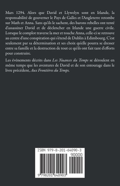 Mars 1294. Alors que David et Llywelyn sont en Irlande, la responsabilité de gouverner le Pays de Galles et l'Angleterre retombe sur Math et Anna. Sans qu'ils le sachent, des barons rebelles ont tenté d'assassiner David et de déclencher en Irlande une guerre civile. Lorsque le complot traverse la mer et touche Anna, celle-ci se retrouve au centre d'une conspiration qui s'étend de Dublin à Edimbourg. C'est seulement par sa détermination et ses choix qu'elle pourra se dresser entre sa famille et la destruction de tout ce qu'ils ont fait tant d'efforts pour construire. Les événements décrits dans Les Nuances du Temps se déroulent en même temps que les aventures de David et de son entourage dans le livre précédent, Aux Frontières du Temps.