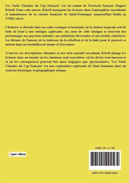 Les Nuits Chaudes du Cap Français" est un roman de l'écrivain français Hugues Rebell. Dans cette ¿uvre, Rebell transporte les lecteurs dans l'atmosphère envoûtante et tumultueuse de la colonie française de Saint-Domingue (aujourd'hui Haïti) au XVIIIe siècle. L'histoire se déroule dans un cadre exotique et luxuriant, où la chaleur tropicale sert de toile de fond à une intrigue captivante. Au c¿ur de cette intrigue se trouvent des personnages aux passions ardentes, aux ambitions dévorantes et aux destins entrelacés. Les thèmes de l'amour, de la trahison, de la rébellion et de la lutte pour le pouvoir se mêlent dans un tourbillon de drame et d'aventure. À travers ses descriptions vibrantes et son style narratif envoûtant, Rebell plonge les lecteurs dans un monde où les émotions sont exacerbées, où les désirs sont inassouvis et où les conséquences peuvent être aussi tragiques que spectaculaires. "Les Nuits Chaudes du Cap Français" est une exploration captivante de l'âme humaine dans un contexte historique et géographique unique.