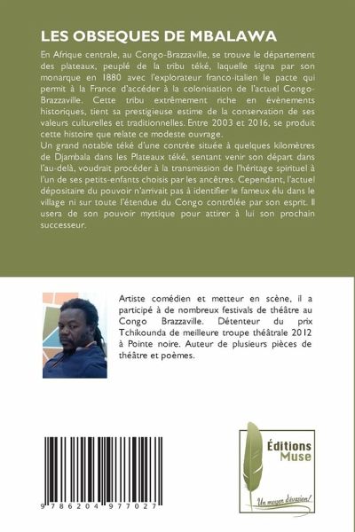 En Afrique centrale, au Congo-Brazzaville, se trouve le département des plateaux, peuplé de la tribu téké, laquelle signa par son monarque en 1880 avec l'explorateur franco-italien le pacte qui permit à la France d'accéder à la colonisation de l'actuel Congo-Brazzaville. Cette tribu extrêmement riche en évènements historiques, tient sa prestigieuse estime de la conservation de ses valeurs culturelles et traditionnelles. Entre 2003 et 2016, se produit cette histoire que relate ce modeste ouvrage.Un grand notable téké d'une contrée située à quelques kilomètres de Djambala dans les Plateaux téké, sentant venir son départ dans l'au-delà, voudrait procéder à la transmission de l'héritage spirituel à l'un de ses petits-enfants choisis par les ancêtres. Cependant, l'actuel dépositaire du pouvoir n'arrivait pas à identifier le fameux élu dans le village ni sur toute l'étendue du Congo contrôlée par son esprit. Il usera de son pouvoir mystique pour attirer à lui son prochain successeur.