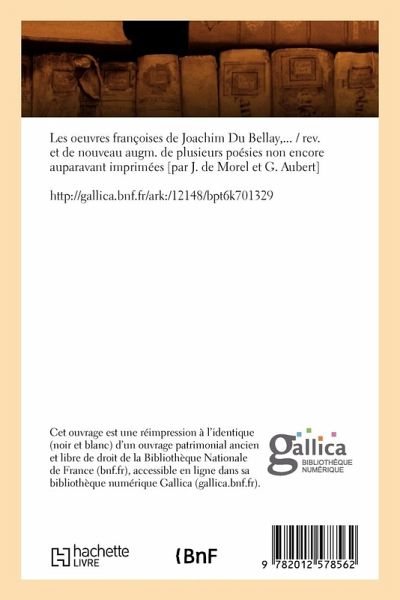 Les oeuvres francoises de Joachim Du Bellay,... / rev. et de nouveau augm. de plusieurs poesies non encore auparavant imprimees [par J. de Morel et G. Aubert]Date de l'edition originale : 1569Comprend : Deux livres de l'eneide de Virgile, le quatrieme et le sixiemeCe livre est la reproduction fidele d'une oeuvre publiee avant 1920 et fait partie d'une collection de livres reimprimes a la demande editee par Hachette Livre, dans le cadre d'un partenariat avec la Bibliotheque nationale de France, offrant l'opportunite d'acceder a des ouvrages anciens et souvent rares issus des fonds patrimoniaux de la BnF.Les oeuvres faisant partie de cette collection ont ete numerisees par la BnF et sont presentes sur Gallica, sa bibliotheque numerique.En entreprenant de redonner vie a ces ouvrages au travers d'une collection de livres reimprimes a la demande, nous leur donnons la possibilite de rencontrer un public elargi et participons a la transmission de connaissances et de savoirs parfois difficilement accessibles.Nous avons cherche a concilier la reproduction fidele d'un livre ancien a partir de sa version numerisee avec le souci d'un confort de lecture optimal. Nous esperons que les ouvrages de cette nouvelle collection vous apporteront entiere satisfaction.Pour plus d'informations, rendez-vous sur www.hachettebnf.frhttp://gallica.bnf.fr/ark:/12148/bpt6k701329