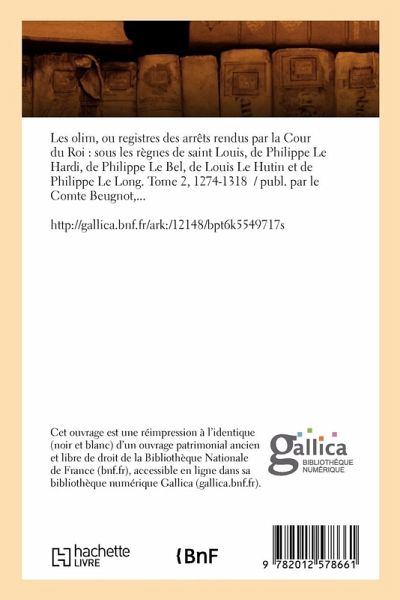 Les Olim, ou Registres des arrets rendus par la Cour du Roi: sous les regnes de Saint Louis, de Philippe Le Hardi, de Philippe Le Bel, de Louis Le Hutin et de Philippe Le Long. Tome 3, Partie 1 / publies par le comte Beugnot, ...Date de l'edition originale: 1839-1848Sujet de l'ouvrage: France -- Politique et gouvernement -- 987-1328 -- SourcesCollection: Collection de documents inedits sur l'histoire de FranceCe livre est la reproduction fidele d'une oeuvre publiee avant 1920 et fait partie d'une collection de livres reimprimes a la demande editee par Hachette Livre, dans le cadre d'un partenariat avec la Bibliotheque nationale de France, offrant l'opportunite d'acceder a des ouvrages anciens et souvent rares issus des fonds patrimoniaux de la BnF.Les oeuvres faisant partie de cette collection ont ete numerisees par la BnF et sont presentes sur Gallica, sa bibliotheque numerique.En entreprenant de redonner vie a ces ouvrages au travers d'une collection de livres reimprimes a la demande, nous leur donnons la possibilite de rencontrer un public elargi et participons a la transmission de connaissances et de savoirs parfois difficilement accessibles.Nous avons cherche a concilier la reproduction fidele d'un livre ancien a partir de sa version numerisee avec le souci d'un confort de lecture optimal. Nous esperons que les ouvrages de cette nouvelle collection vous apporteront entiere satisfaction.Pour plus d'informations, rendez-vous sur www.hachettebnf.frhttp: //gallica.bnf.fr/ark: /12148/bpt6k5549717s