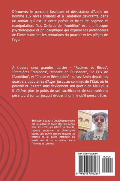 Découvrez le parcours fascinant et dévastateur d'Amin, un homme aux rêves brûlants et à l'ambition dévorante, dans un roman qui oscille entre poésie et brutalité, sagesse et manipulation. *Les Ombres de l'Ambition* est une fresque psychologique et philosophique qui explore les profondeurs de l'âme humaine, les tentations du pouvoir et les pièges de l'ego. À travers cinq grandes parties - *Racines et Rêves*, *Premières Trahisons*, *Montée en Puissance*, *Le Prix de l'Ambition*, et *Chute et Révélation* - suivez Amin depuis les quartiers populaires d'Alger jusqu'au sommet de l'État, où le pouvoir et les trahisons deviennent son quotidien. Mais plus il s'élève, plus le poids de ses sacrifices et de ses trahisons pèse lourd sur lui, jusqu'à éroder l'homme qu'il pensait être. Guidé et parfois hanté par les adages énigmatiques d'un narrateur soufi, Amin est confronté à des dilemmes moraux qui remettent en question tout ce qu'il a construit. Chaque chapitre dévoile une nouvelle facette de son ascension et de sa chute, laissant entrevoir l'ombre de son destin tragique. Au fur et à mesure qu'il gravit les échelons du pouvoir, Amin se perd dans un labyrinthe de miroirs déformants, où l'ambition se révèle être une force aussi destructrice qu'irrésistible. Dans ce roman, la structure même des chapitres invite à une introspection, chaque titre étant une porte ouverte vers les thèmes de la loyauté, de la trahison, de l'ego, de l'humanité, et de la solitude. Au fil de l'histoire, le lecteur est poussé à se demander: jusqu'où sommes-nous prêts à aller pour atteindre nos rêves ? Et que reste-t-il de nous lorsque l'ambition a tout consumé ? Entre philosophie soufie et réalisme implacable, *Les Ombres de l'Ambition* vous invite à plonger dans une exploration sombre et captivante de la condition humaine, où les choix de l'individu, même les plus subtils, forgent son destin. Ce roman est bien plus qu'une simple histoire d'ascension et de chute; c'est une méditation profonde sur le prix de l'ambition, sur les illusions du pouvoir, et sur la liberté intérieure que l'on trouve parfois... dans la chute elle-même. Un roman hypnotique et imprégné de sagesse, qui saura captiver ceux qui osent se confronter aux ombres de leur propre ambition. *Les Ombres de l'Ambition* vous attend, pour un voyage au coeur des plus sombres désirs de l'âme humaine et des fragilités qui nous rendent humains.