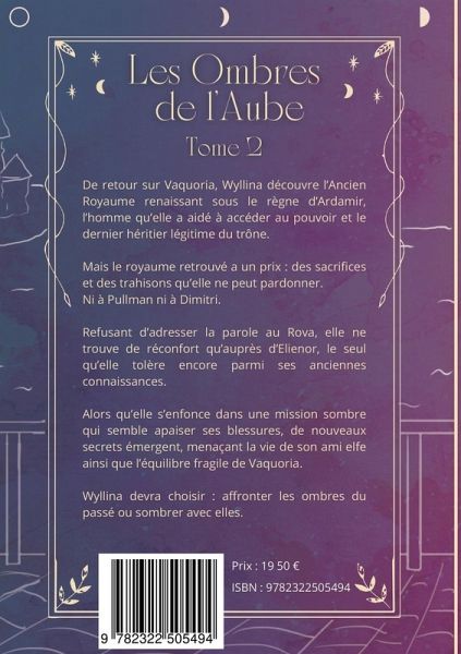 De retour sur Vaquoria, Wyllina découvre l'Ancien Royaume renaissant sous le règne d'Ardamir, l'homme qu'elle a aidé à accéder au pouvoir et le dernier héritier légitime du trône. Mais le royaume retrouvé à un prix : des sacrifices et des trahisons qu'elle ne peut pardonner. Ni à Pullman ni à Dimitri. Refusant d'adresser la parole au Rova, elle ne trouve du réconfort qu'auprès d'Elienor, l'elfe qu'elle est le seul à tolérer parmi ses anciennes connaissances. Alors qu'elle s'enfonce dans une mission sombre qui semble apaiser ses blessures, de nouveaux secrets émergent, menaçant la vie de son ami elfe ainsi que l'équilibre fragile de Vaquoria. Wyllina devra choisir : affronter les ombres du passé ou sombrer avec elles.