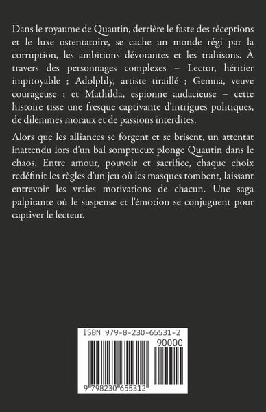 Dans le royaume de Quautin, derrière le faste des réceptions et le luxe ostentatoire, se cache un monde régi par la corruption, les ambitions dévorantes et les trahisons. À travers des personnages complexes - Lector, héritier impitoyable ; Adolphly, artiste tiraillé ; Gemna, veuve courageuse ; et Mathilda, espionne audacieuse - cette histoire tisse une fresque captivante d'intrigues politiques, de dilemmes moraux et de passions interdites. Alors que les alliances se forgent et se brisent, un attentat inattendu lors d'un bal somptueux plonge Quautin dans le chaos. Entre amour, pouvoir et sacrifice, chaque choix redéfinit les règles d'un jeu où les masques tombent, laissant entrevoir les vraies motivations de chacun. Une saga palpitante où le suspense et l'émotion se conjuguent pour captiver le lecteur.