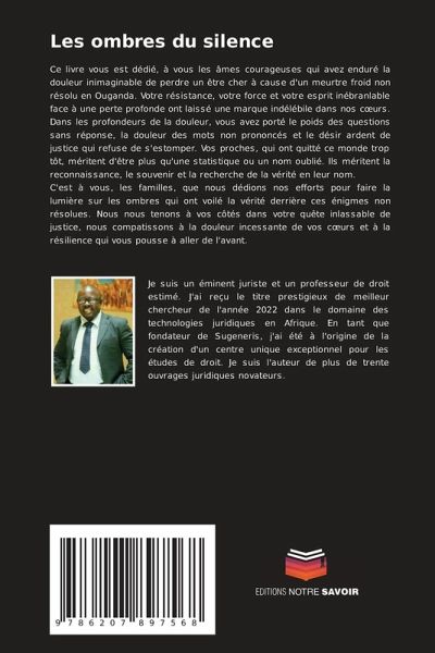 Ce livre vous est dédié, à vous les âmes courageuses qui avez enduré la douleur inimaginable de perdre un être cher à cause d'un meurtre froid non résolu en Ouganda. Votre résistance, votre force et votre esprit inébranlable face à une perte profonde ont laissé une marque indélébile dans nos coeurs.Dans les profondeurs de la douleur, vous avez porté le poids des questions sans réponse, la douleur des mots non prononcés et le désir ardent de justice qui refuse de s'estomper. Vos proches, qui ont quitté ce monde trop tôt, méritent d'être plus qu'une statistique ou un nom oublié. Ils méritent la reconnaissance, le souvenir et la recherche de la vérité en leur nom.C'est à vous, les familles, que nous dédions nos efforts pour faire la lumière sur les ombres qui ont voilé la vérité derrière ces énigmes non résolues. Nous nous tenons à vos côtés dans votre quête inlassable de justice, nous compatissons à la douleur incessante de vos coeurs et à la résilience qui vous pousse à aller de l'avant.