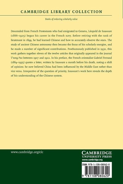 Descended from French Protestants who had emigrated to Geneva, Léopold de Saussure (1866-1925) began his career in the French navy. Before retiring with the rank of lieutenant in 1899, he had learned Chinese and how to accurately observe the stars. The study of ancient Chinese astronomy then became the focus of his scholarly energies, and he made a number of significant contributions. Posthumously published in 1930, this work gathers together eleven of the twelve articles that originally appeared in the journal T'oung Pao between 1907 and 1922. In his preface, the French orientalist Gabriel Ferrand (1864-1935) quotes a letter, written by Saussure a month before his death, noting a shift of opinion: he now believed China had been influenced by the Middle East rather than vice versa. Irrespective of the question of priority, Saussure's work here reveals the depth of his understanding of the Chinese system.