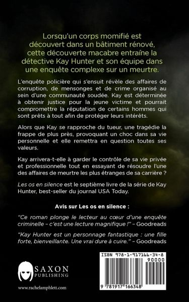 Lorsqu'un corps momifié est découvert dans un bâtiment rénové, cette découverte macabre entraîne la détective Kay Hunter et son équipe dans une enquête complexe sur un meurtre. L'enquête policière qui s'ensuit révèle des affaires de corruption, de mensonges et de crime organisé au sein d'une communauté soudée. Kay est déterminée à obtenir justice pour la jeune victime et pourrait compromettre la réputation de certains hommes qui sont prêts à tout afin de protéger leurs intérêts. Alors que Kay se rapproche du tueur, une tragédie la frappe de plus près, provoquant un choc dans sa vie personnelle et elle remettra en question toutes ses valeurs. Kay arrivera-t-elle à garder le contrôle de sa vie privée et professionnelle tout en essayant de résoudre l'une des affaires de meurtre les plus étranges de sa carrière ? Les os en silence est le septième livre de la série de Kay Hunter, best-seller du journal USA Today. Avis sur Les os en silence: "Ce roman plonge le lecteur au coeur d'une enquête criminelle - c'est une lecture magnifique !" - Goodreads "Kay Hunter est un personnage fantastique: une fille forte, bienveillante. Une vrai dure à cuire." - Goodreads Les enquêtes de Détective Kay Hunter: 1. Mort de peur 2. La volonté de vivre 3. Innocence mortelle 4. L'enfer à payer 5. Un secret bien gardé 6. Les derniers vestiges 7. Les os en silence 8. Du berceau à la tombe 9. Pas d'évasion 10. Une mort solitaire 11. Un secret mortel 12. Une vengeance amère 13. Une promesse mortelle 14. Un silence fatal