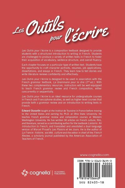 Les Outils pour l'écrire is a composition textbook designed to provide students with a structured introduction to writing in French. Students are challenged to produce a variety of written texts in French to foster their acquisition of vocabulary, sentence structure, and overall fluency. Each chapter focuses on a particular type of written text. Students have the opportunity to craft character portraits, resumes, job applications, dissertations, and essays in French. They learn how to tell stories and write literature reviews confidently and effectively. Les Outils pour l'écrire is designed to be used in association with the French grammar textbook, La Grammaire pour le dire. With these two complementary resources, instructors will be well-equipped to teach French grammar review and French composition, either concurrently or sequentially. Les Outils pour l'écrire is an ideal resource for undergraduate courses in French and Francophone studies, as well as higher-level courses that provide both a grammar review and an introduction to writing texts in French.