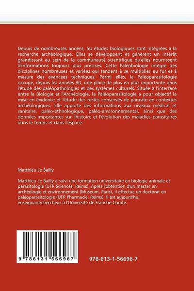 Matthieu Le Bailly a suivi une formation universitaire en biologie animale et parasitologie (UFR Sciences, Reims). Après l''obtention d''un master en archéologie et environnement (Muséum, Paris), il effectue un doctorat en paléoparasitologie (UFR Pharmacie, Reims). Il est aujourd''hui enseignant/chercheur à l''Université de Franche-Comté.
