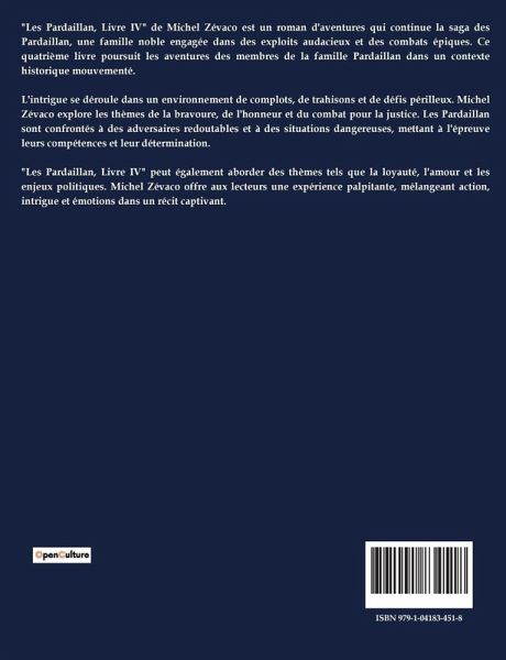 "Les Pardaillan, Livre IV" de Michel Zévaco est un roman d'aventures qui continue la saga des Pardaillan, une famille noble engagée dans des exploits audacieux et des combats épiques. Ce quatrième livre poursuit les aventures des membres de la famille Pardaillan dans un contexte historique mouvementé. L'intrigue se déroule dans un environnement de complots, de trahisons et de défis périlleux. Michel Zévaco explore les thèmes de la bravoure, de l'honneur et du combat pour la justice. Les Pardaillan sont confrontés à des adversaires redoutables et à des situations dangereuses, mettant à l'épreuve leurs compétences et leur détermination. "Les Pardaillan, Livre IV" peut également aborder des thèmes tels que la loyauté, l'amour et les enjeux politiques. Michel Zévaco offre aux lecteurs une expérience palpitante, mélangeant action, intrigue et émotions dans un récit captivant.