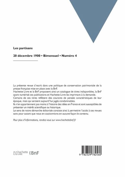Les Partisans: revue de combat, d'art, de littérature et de sociologie, bi-mensuelle illustrée / sous la direction de MM. Paul Ferniot et Paul-Redonnel Date de l'édition originale: 1900-12-20 La présente revue s'inscrit dans une politique de conservation patrimoniale de la presse française mise en place avec la BnF. Hachette Livre et la BnF proposent ainsi un catalogue de titres indisponibles, la BnF ayant numérisé ces publications et Hachette Livre les imprimant à la demande. Certains de ces titres reflètent des courants de pensée caractéristiques de leur époque, mais qui seraient aujourd'hui jugés condamnables. Ils n'en appartiennent pas moins à l'histoire des idées en France et sont susceptibles de présenter un intérêt scientifique ou historique. Le sens de notre démarche éditoriale consiste ainsi à permettre l'accès à ces revues sans pour autant que nous en cautionnions en aucune façon le contenu. Pour plus d'informations, rendez-vous sur www.hachettebnf.fr