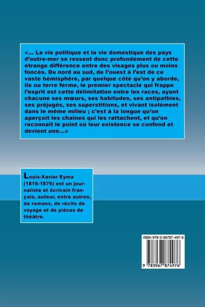 ... La vie politique et la vie domestique des pays d'outre-mer se ressent donc profondément de cette étrange différence entre des visages plus ou moins foncés. Du nord au sud, de l'ouest à l'est de ce vaste hémisphère, par quelque côté qu'on y aborde, île ou terre ferme, le premier spectacle qui frappe l'esprit est cette délimitation entre les races, ayant chacune ses m¿urs, ses habitudes, ses antipathies, ses préjugés, ses superstitions, et vivant isolément dans le même milieu ; c'est à la longue qu'on aperçoit les chaînes qui les rattachent, et qu'on reconnaît le point où leur existence se confond et devient une...