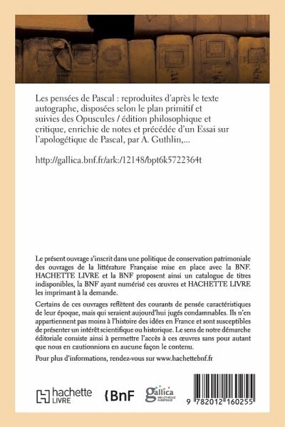 Les pensees de Pascal : reproduites d'apres le texte autographe, disposees selon le plan primitif et suivies des Opuscules / edition philosophique et critique, enrichie de notes et precedee d'un Essai sur l'apologetique de Pascal, par A. Guthlin,...Date de l'edition originale : 1896Ce livre est la reproduction fidele d'une oeuvre publiee avant 1920 et fait partie d'une collection de livres reimprimes a la demande editee par Hachette Livre, dans le cadre d'un partenariat avec la Bibliotheque nationale de France, offrant l'opportunite d'acceder a des ouvrages anciens et souvent rares issus des fonds patrimoniaux de la BnF.Les oeuvres faisant partie de cette collection ont ete numerisees par la BnF et sont presentes sur Gallica, sa bibliotheque numerique.En entreprenant de redonner vie a ces ouvrages au travers d'une collection de livres reimprimes a la demande, nous leur donnons la possibilite de rencontrer un public elargi et participons a la transmission de connaissances et de savoirs parfois difficilement accessibles.Nous avons cherche a concilier la reproduction fidele d'un livre ancien a partir de sa version numerisee avec le souci d'un confort de lecture optimal. Nous esperons que les ouvrages de cette nouvelle collection vous apporteront entiere satisfaction.Pour plus d'informations, rendez-vous sur www.hachettebnf.frhttp://gallica.bnf.fr/ark:/12148/bpt6k5722364t
