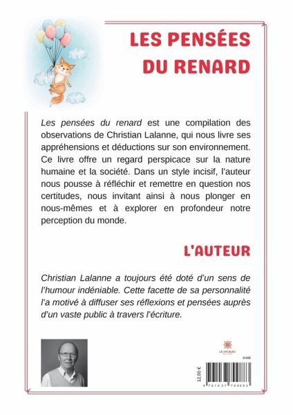 Les pensées du renard est une compilation des observations de Christian Lalanne, qui nous livre ses appréhensions et déductions sur son environnement. Ce livre offre un regard perspicace sur la nature humaine et la société. Dans un style incisif, l¿auteur nous pousse à réfléchir et remettre en question nos certitudes, nous invitant ainsi à nous plonger en nous-mêmes et à explorer en profondeur notre perception du monde.