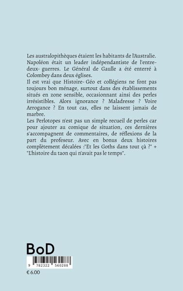 Mais où vont-il chercher tout ça? Les australopithèques étaient les habitants de l'Australie. Napoléon était un leader indépendantiste de l'entre-deux-guerres. Le Général de Gaulle a été enterré à Colombey dans deux églises. Il est vrai que Histoire-Géo et collégiens ne font pas toujours bon ménage, surtout dans des établissements situés en zone sensible, occasionnant ainsi des perles irrésistibles. Les Perlotopes n'est pas un simple recueil de perles. Pour ajouter au comique de situation, ces dernières s'accompagnent de commentaires, de réflexions de la part du prof. Une lecture plus qu'amusante avec en bonus deux histoires complètement décalées :"Et les Goths dans tout çà?" et "L'histoire du taon qui n'avait pas le temps".
