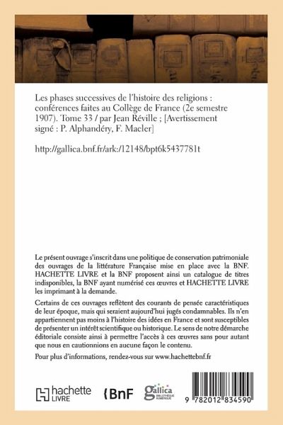 Les phases successives de l'histoire des religions: conférences faites au Collège de France (2e semestre 1907). Tome 33 / par Jean Réville; [Avertissement signé P. Alphandéry, F. Macler] Date de l'édition originale: 1909 Collection: Bibliothèque de vulgarisation; 33 Le présent ouvrage s'inscrit dans une politique de conservation patrimoniale des ouvrages de la littérature Française mise en place avec la BNF. HACHETTE LIVRE et la BNF proposent ainsi un catalogue de titres indisponibles, la BNF ayant numérisé ces oeuvres et HACHETTE LIVRE les imprimant à la demande. Certains de ces ouvrages reflètent des courants de pensée caractéristiques de leur époque, mais qui seraient aujourd'hui jugés condamnables. Ils n'en appartiennent pas moins à l'histoire des idées en France et sont susceptibles de présenter un intérêt scientifique ou historique. Le sens de notre démarche éditoriale consiste ainsi à permettre l'accès à ces oeuvres sans pour autant que nous en cautionnions en aucune façon le contenu. Pour plus d'informations, rendez-vous sur www.hachettebnf.fr