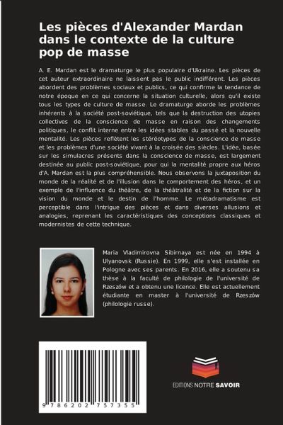 . . Mardan est le dramaturge le plus populaire d'Ukraine. Les pièces de cet auteur extraordinaire ne laissent pas le public indifférent. Les pièces abordent des problèmes sociaux et publics, ce qui confirme la tendance de notre époque en ce qui concerne la situation culturelle, alors qu'il existe tous les types de culture de masse. Le dramaturge aborde les problèmes inhérents à la société post-soviétique, tels que la destruction des utopies collectives de la conscience de masse en raison des changements politiques, le conflit interne entre les idées stables du passé et la nouvelle mentalité. Les pièces reflètent les stéréotypes de la conscience de masse et les problèmes d'une société vivant à la croisée des siècles. L'idée, basée sur les simulacres présents dans la conscience de masse, est largement destinée au public post-soviétique, pour qui la mentalité propre aux héros d'A. Mardan est la plus compréhensible. Nous observons la juxtaposition du monde de la réalité et de l'illusion dans le comportement des héros, et un exemple de l'influence du théâtre, de la théâtralité et de la fiction sur la vision du monde et le destin de l'homme. Le métadramatisme est perceptible dans l'intrigue des pièces et dans diverses allusions et analogies, reprenant les caractéristiques des conceptions classiques et modernistes de cette technique.