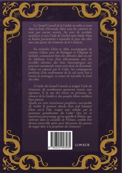 Le grand conseil de la guilde va enfin se tenir dans la forêt d'Ereenda. Mais tous les convives ne sont pas encore arrivés. Au prix de terribles sacrifices et avec l'aide de l'archer nain Aïtak, Nina et Kialos parviennent à rejoindre le pays des elfes avec une partie du Grimoire de la création.En revanche, Elten et Alda, accompagnés du conteur Gilian, puis de Radagast et Filigrane la farfadet, connaissent bien des déboires dans la cité de Glithaor. Lors d'un affrontement avec les terribles alviones, des êtres fantomatiques aux pouvoirs surnaturels venus tout droit du Kartawak, Gilian est capturé par le Culte. Ses compagnons profitent d'un soulèvement de la cité pour fuir à travers la montagne et tenter de rejoindre la forêt des elfes.À l'aube du Grand Conseil et malgré l'aide du Grimoire, de nombreuses questions restent sans réponses. À la vue des forces en présence, les chances de la Guilde et des peuples libres semblent bien minces. Quelle est cette mystérieuse prophétie, susceptible de révéler le pouvoir absolu d'un seul homme? Elten est-il l'élu, traqué sans relâche par la puissance grandissante du Culte? Qui est ce mystérieux personnage qu'on appelle le Maître, qui enfermé dans la citadelle de Pieltaos, semble être devenu invincible après avoir découvert des pierres de magie liées à la prophétie du Grimoire?