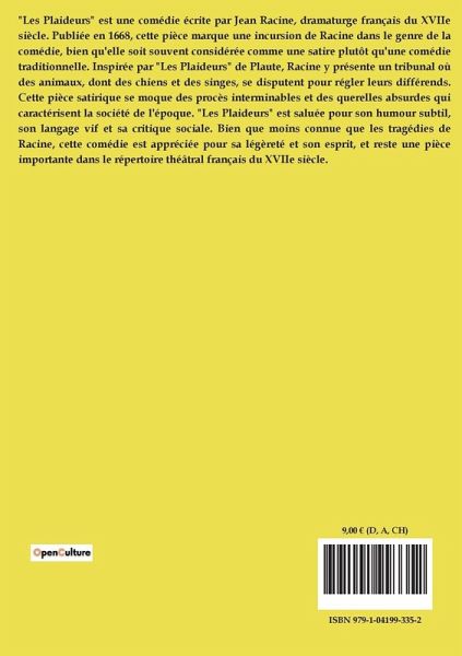 "Les Plaideurs" est une comédie écrite par Jean Racine, dramaturge français du XVIIe siècle. Publiée en 1668, cette pièce marque une incursion de Racine dans le genre de la comédie, bien qu'elle soit souvent considérée comme une satire plutôt qu'une comédie traditionnelle. Inspirée par "Les Plaideurs" de Plaute, Racine y présente un tribunal où des animaux, dont des chiens et des singes, se disputent pour régler leurs différends. Cette pièce satirique se moque des procès interminables et des querelles absurdes qui caractérisent la société de l'époque. "Les Plaideurs" est saluée pour son humour subtil, son langage vif et sa critique sociale. Bien que moins connue que les tragédies de Racine, cette comédie est appréciée pour sa légèreté et son esprit, et reste une pièce importante dans le répertoire théâtral français du XVIIe siècle.