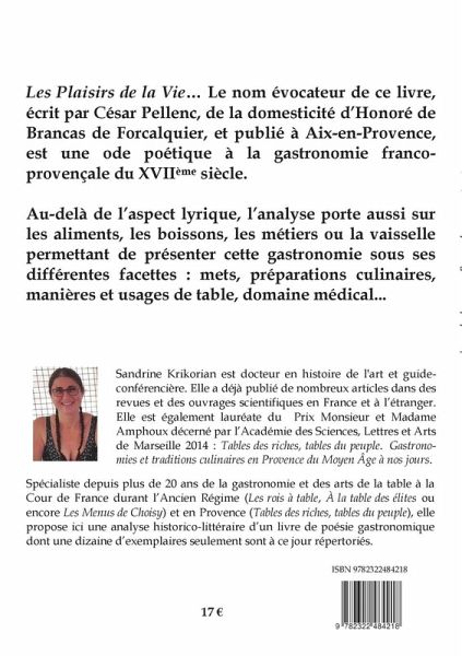 Les Plaisirs de la Vie... Le nom évocateur de ce livre, écrit par César Pellenc, de la domesticité d'Honoré de Brancas de Forcalquier, et publié à Aix-en-Provence, est une ode poétique à la gastronomie franco-provençale du XVIIème siècle.Au-delà de l'aspect lyrique, l'analyse porte aussi sur les aliments, les boissons, les métiers ou la vaisselle permettant de présenter cette gastronomie sous ses différentes facettes : mets, préparations culinaires, manières et usages de table, domaine médical...