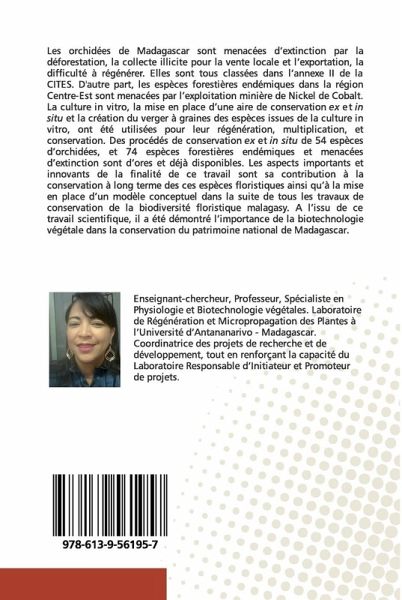 Les orchidées de Madagascar sont menacées d'extinction par la déforestation, la collecte illicite pour la vente locale et l'exportation, la difficulté à régénérer. Elles sont tous classées dans l'annexe II de la CITES. D'autre part, les espèces forestières endémiques dans la région Centre-Est sont menacées par l'exploitation minière de Nickel de Cobalt. La culture in vitro, la mise en place d'une aire de conservation ex et in situ et la création du verger à graines des espèces issues de la culture in vitro, ont été utilisées pour leur régénération, multiplication, et conservation. Des procédés de conservation ex et in situ de 54 espèces d'orchidées, et 74 espèces forestières endémiques et menacées d'extinction sont d'ores et déjà disponibles. Les aspects importants et innovants de la finalité de ce travail sont sa contribution à la conservation à long terme des ces espèces floristiques ainsi qu'à la mise en place d'un modèle conceptuel dans la suite de tous les travaux de conservation de la biodiversité floristique malagasy. A l'issu de ce travail scientifique, il a été démontré l'importance de la biotechnologie végétale dans la conservation du patrimoine national de Madagascar.