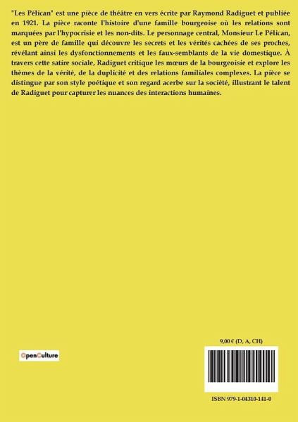 "Les Pélican" est une pièce de théâtre en vers écrite par Raymond Radiguet et publiée en 1921. La pièce raconte l'histoire d'une famille bourgeoise où les relations sont marquées par l'hypocrisie et les non-dits. Le personnage central, Monsieur Le Pélican, est un père de famille qui découvre les secrets et les vérités cachées de ses proches, révélant ainsi les dysfonctionnements et les faux-semblants de la vie domestique. À travers cette satire sociale, Radiguet critique les m¿urs de la bourgeoisie et explore les thèmes de la vérité, de la duplicité et des relations familiales complexes. La pièce se distingue par son style poétique et son regard acerbe sur la société, illustrant le talent de Radiguet pour capturer les nuances des interactions humaines.