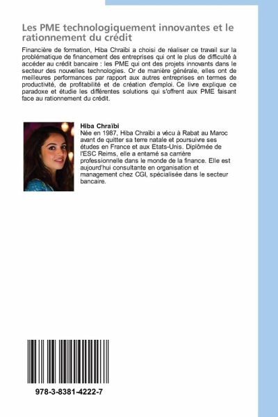 Financière de formation, Hiba Chraïbi a choisi de réaliser ce travail sur la problématique de financement des entreprises qui ont le plus de difficulté à accéder au crédit bancaire : les PME qui ont des projets innovants dans le secteur des nouvelles technologies. Or de manière générale, elles ont de meilleures performances par rapport aux autres entreprises en termes de productivité, de profitabilité et de création d'emploi. Ce livre explique ce paradoxe et étudie les différentes solutions qui s'offrent aux PME faisant face au rationnement du crédit.