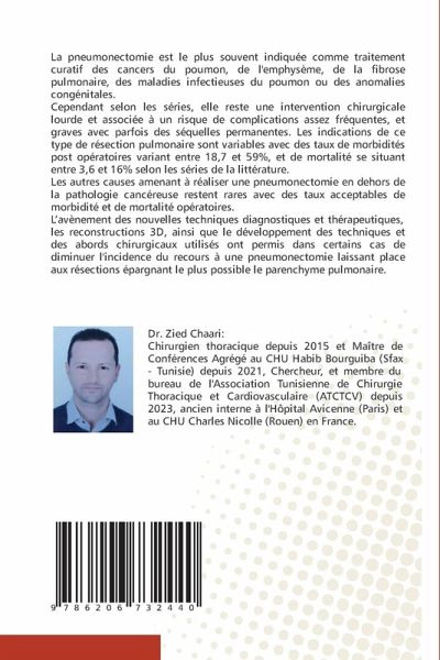 La pneumonectomie est le plus souvent indiquée comme traitement curatif des cancers du poumon, de l'emphysème, de la fibrose pulmonaire, des maladies infectieuses du poumon ou des anomalies congénitales. Cependant selon les séries, elle reste une intervention chirurgicale lourde et associée à un risque de complications assez fréquentes, et graves avec parfois des séquelles permanentes. Les indications de ce type de résection pulmonaire sont variables avec des taux de morbidités post opératoires variant entre 18,7 et 59%, et de mortalité se situant entre 3,6 et 16% selon les séries de la littérature.Les autres causes amenant à réaliser une pneumonectomie en dehors de la pathologie cancéreuse restent rares avec des taux acceptables de morbidité et de mortalité opératoires.L'avènement des nouvelles techniques diagnostiques et thérapeutiques, les reconstructions 3D, ainsi que le développement des techniques et des abords chirurgicaux utilisés ont permis dans certains cas de diminuer l'incidence du recours à une pneumonectomie laissant place aux résections épargnant le plus possible le parenchyme pulmonaire.