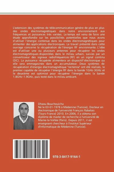 L'extension des systèmes de télécommunication génère de plus en plus des ondes électromagnétiques dans notre environnement aux fréquences et puissances très variées. Le temps est venu de faire une étude approfondie sur les possibilités potentielles que nous avons d'utiliser l'énergie contenue dans les ondes électromagnétiques pour alimenter des applications électroniques. Le travail présenté dans cette ouvrage concerne la récupération de l'énergie RF environnante. L'idée est d'utiliser une ou plusieurs antennes pour récupérer les ondes électromagnétiques disponibles dans le milieu urbain, suivies par un convertisseur des signaux radiofréquences (RF) en un signal continu (DC). La puissance récupérée alimentera un dispositif électronique ou elle sera emmagasinée dans un accumulateur. Deux systèmes de récupération d'énergie électromagnétique "rectenna" ont été réalisés, le premier capable de récupérer l'énergie RF dans la bande 1GHz-3GHz et le deuxième est optimisé pour récupérer l'énergie dans la bande 1.8GHz-1.9GHz, puis testé dans le milieu ambiant.