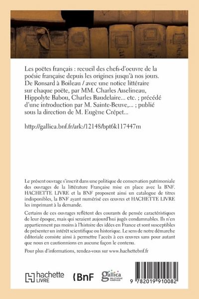 Les poëtes français: recueil des chefs-d'oeuvre de la poésie française depuis les origines jusqu'à nos jours. De Ronsard à Boileau / avec une notice littéraire sur chaque poëte, par MM. Charles Asselineau, Hippolyte Babou, Charles Baudelaire... etc.; précédé d'une introduction par M. Sainte-Beuve, ...; publié sous la direction de M. Eugène Crépet... Date de l'édition originale: 1861-1863 Le présent ouvrage s'inscrit dans une politique de conservation patrimoniale des ouvrages de la littérature Française mise en place avec la BNF. HACHETTE LIVRE et la BNF proposent ainsi un catalogue de titres indisponibles, la BNF ayant numérisé ces oeuvres et HACHETTE LIVRE les imprimant à la demande. Certains de ces ouvrages reflètent des courants de pensée caractéristiques de leur époque, mais qui seraient aujourd'hui jugés condamnables. Ils n'en appartiennent pas moins à l'histoire des idées en France et sont susceptibles de présenter un intérêt scientifique ou historique. Le sens de notre démarche éditoriale consiste ainsi à permettre l'accès à ces oeuvres sans pour autant que nous en cautionnions en aucune façon le contenu. Pour plus d'informations, rendez-vous sur www.hachettebnf.fr