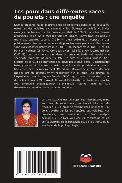 Dans la présente étude, la prévalence de différentes espèces de poux a été notée sur des volailles appartenant à des élevages organisés et à des élevages de basse-cour. La prévalence était de 100 % dans les fermes organisées et de 62 % chez les volailles locales. Parmi tous les oiseaux examinés, Lipeurus caponis (41,30 %) s'est avéré être l'espèce la plus prédominante. Les autres espèces de poux trouvées par ordre décroissant sont Cuclotogaster heterographus (40,87 %), Menacanthus spp (31,74 %), Menopon gallinae (18,70 %), Goniodes gigas (4,35 %) et Goniocotes gallinae (2,61 %). Les poux rencontrés dans la présente étude ont montré une spécificité régionale marquée. La tête, les ailes et le corps sont les trois régions où le taux d'occurrence des poux est le plus élevé. Cuclotogaster heterographus et Lipeurus caponis ont été trouvés principalement sur la tête et les ailes respectivement. De même, Menacanthus spp et Menopon gallinae ont été principalement rencontrés sur le corps. Les oiseaux de l'exploitation avicole organisée du CPDO appartenant à quatre races distinctes, à savoir WLH, Aseel, Giriraj et Kadaknath, ont également montré une différence statistiquement significative (P 0,05) dans le taux d'occurrence des différentes espèces de poux.