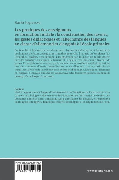 Ce livre décrit la construction des savoirs, les gestes didactiques et l'alternance des langues de futurs enseignants primaires genevois. Il montre qu'enseigner l'allemand et l'anglais, c'est débuter l'enseignement par des actes de parole insérés dans les dialogues. Enseigner l'allemand et l'anglais, c'est utiliser une diversité de gestes. En anglais, cela se traduit par la recherche d'une réflexion métalinguistique lors des moments d'institutionnalisation, et en allemand, par la continuité du travail scolaire lors de la création de la mémoire didactique. Enseigner l'allemand et l'anglais, c'est aussi alterner les langues avec des fonctions précises facilitant le passage d'une langue à une autre.