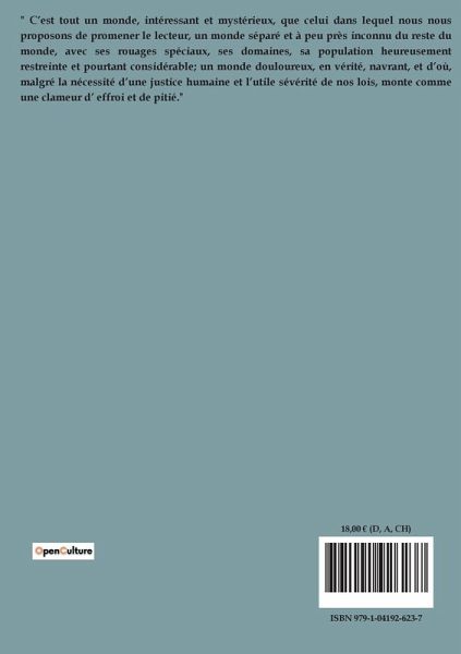 " C¿est tout un monde, intéressant et mystérieux, que celui dans lequel nous nous proposons de promener le lecteur, un monde séparé et à peu près inconnu du reste du monde, avec ses rouages spéciaux, ses domaines, sa population heureusement restreinte et pourtant considérable; un monde douloureux, en vérité, navrant, et d¿où, malgré la nécessité d¿une justice humaine et l¿utile sévérité de nos lois, monte comme une clameur d¿ effroi et de pitié."