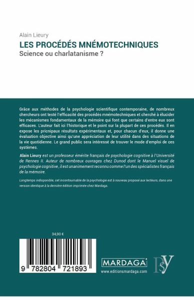 Grâce aux méthodes de la psychologie scientifique contemporaine, de nombreux chercheurs ont testé l'efficacité des procédés mnémotechniques et cherché à élucider les mécanismes fondamentaux de la mémoire qui font que certains d'entre eux sont efficaces. L'auteur fait ici l'historique et le point sur la plupart de ces procédés. Il en expose les pricnipaux résultats expérimentaux et, pour chacun d'eux, il donne une évaluation objective ainsi qu'une appréciation de leur utilité dans des situations de la vie quotidienne. Le grand public sera intéressé de trouver le mode d'emploi de ces systèmes. Alain Lieury est un professeur émérite français de psychologie cognitive à l'Université de Rennes II. Auteur de nombreux ouvrages chez Dunod dont le Manuel visuel de psychologie cognitive, il est unanimement reconnu comme l'un des spécialistes français de la mémoire.