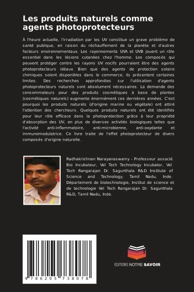 À l'heure actuelle, l'irradiation par les UV constitue un grave problème de santé publique, en raison du réchauffement de la planète et d'autres facteurs environnementaux. Les rayonnements UVA et UVB jouent un rôle essentiel dans les lésions cutanées chez l'homme. Les composés qui peuvent protéger contre les rayons UV nocifs pourraient être des agents photoprotecteurs idéaux. Bien que des agents de protection solaire chimiques soient disponibles dans le commerce, ils présentent certaines limites. Des recherches approfondies sur l'utilisation d'agents photoprotecteurs naturels sont absolument nécessaires. La demande des consommateurs pour des produits cosmétiques à base de plantes (cosmétiques naturels) augmente énormément ces dernières années. C'est pourquoi les produits naturels (d'origine marine ou végétale) ont attiré l'attention des chercheurs. Quelques produits naturels ont été identifiés pour leur rôle efficace dans la photoprotection grâce à leur propriété d'absorption des UV, en plus de diverses activités biologiques telles que l'activité anti-inflammatoire, anti-microbienne, anti-oxydante et immunomodulatrice. Ce livre traite de l'effet photoprotecteur de divers composés d'origine naturelle.