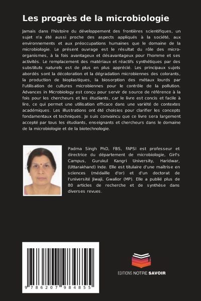 Jamais dans l'histoire du développement des frontières scientifiques, un sujet n'a été aussi proche des aspects appliqués à la société, aux environnements et aux préoccupations humaines que le domaine de la microbiologie. Le présent ouvrage est le résultat du rôle des micro-organismes, à la fois avantageux et désavantageux pour l'homme et ses activités. Le remplacement des matériaux et réactifs synthétiques par des substituts naturels est de plus en plus apprécié. Les principaux sujets abordés sont la décoloration et la dégradation microbiennes des colorants, la production de bioplastiques, la biosorption des métaux lourds par l'utilisation de cultures microbiennes pour le contrôle de la pollution. Advances in Microbiology est conçu pour servir de source de référence à la fois pour les chercheurs et les étudiants, car le livre est concis et facile à lire, ce qui permet une utilisation efficace dans une variété de contextes académiques. Les illustrations ont été choisies pour clarifier les concepts fondamentaux et techniques. Je suis convaincu que ce livre sera largement accepté par tous les étudiants, enseignants et chercheurs dans le domaine de la microbiologie et de la biotechnologie.