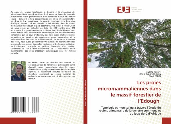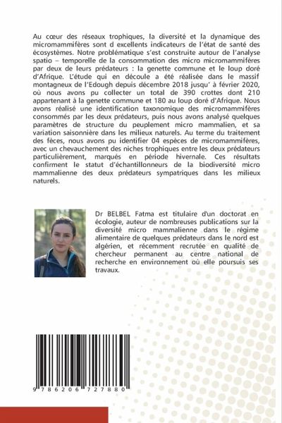 Au coeur des réseaux trophiques, la diversité et la dynamique des micromammifères sont d excellents indicateurs de l'état de santé des écosystèmes. Notre problématique s'est construite autour de l'analyse spatio - temporelle de la consommation des micro micromammifères par deux de leurs prédateurs : la genette commune et le loup doré d'Afrique. L'étude qui en découle a été réalisée dans le massif montagneux de l'Edough depuis décembre 2018 jusqu' à février 2020, où nous avons pu collecter un total de 390 crottes dont 210 appartenant à la genette commune et 180 au loup doré d'Afrique. Nous avons réalisé une identification taxonomique des micromammifères consommés par les deux prédateurs, puis nous avons analysé quelques paramètres de structure du peuplement micro mammalien, et sa variation saisonnière dans les milieux naturels. Au terme du traitement des fèces, nous avons pu identifier 04 espèces de micromammifères, avec un chevauchement des niches trophiques entre les deux prédateurs particulièrement, marqués en période hivernale. Ces résultats confirment le statut d'échantillonneurs de la biodiversité micro mammalienne des deux prédateurs sympatriques dans les milieux naturels.