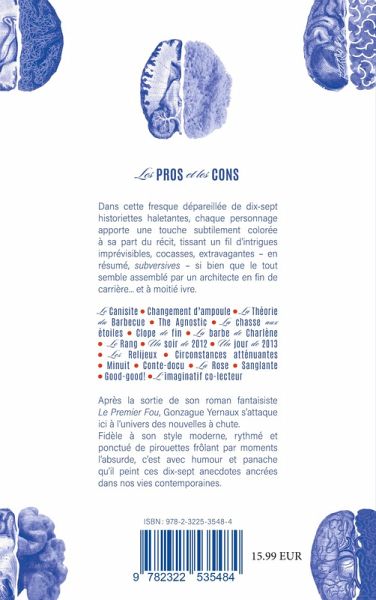 Dans cette fresque dépareillée de dix-sept historiettes haletantes, chaque personnage apporte une touche subtilement colorée à sa part du récit, tissant un fil d'intrigues imprévisibles, cocasses, extravagantes (en résumé, subversives), si bien que le tout semble assemblé par un architecte en fin de carrière... et à moitié ivre. Au programme : Le Canisite, où un introverti fait une rencontre interpellante ; Changement d'ampoule, où une croyance populaire est remise en question ; La Théorie du Barbecue, où des inventions géniales finissent par servir ; The Agnostic, où un médecin de campagne perd la boule ; La chasse aux étoiles, où l'on juge les sanitaires ; Clope de fin, où chaque cigarette se justifie ; La Barbe de Charlène, que Charlène n'assume pas ; Le Rang, où les codes de la restauration sont chamboulés ; Un soir de 2012, où une coupure de courant rend les mamans imprudentes, et Un jour de 2013, où l'on ourdit une vengeance ; Les Relijeux, où des hommes de foi s'affrontent ; Circonstances atténuantes, où l'on interroge les limites du droit humain ; Minuit, où l'inquiétude parentale l'emporte sur le reste ; Conte-docu, où tout est possible, mais pas compréhensible ; La Rose, où l'on passe d'un monde à l'autre ; Sanglante, où l'on se fait charcuter la dentition ; Good-good!, où l'on assiste à un drôle de témoignage ; et enfin L'imaginatif co-lecteur, dont on ne dévoilera rien.