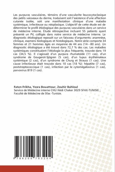 Les purpuras vasculaires, témoins d'une vascularite leucocytoclasique des petits vaisseaux du derme, traduisent soit l'existence d'une affection cutanée isolée, soit une manifestation clinique d'une maladie systémique, infectieuse ou néoplasique. L'objectif de cette étude est de déterminer le profil étiologique des purpuras vasculaires dans un service de médecine interne. Étude rétrospective incluant 55 patients ayant présenté un PV, colligés dans notre service de médecine interne. Le diagnostic étiologique reposait sur un faisceau d'arguments: anamnèse, clinique, examens biologiques et histologiques. Notre série comporte 34 femmes et 21 hommes âgés en moyenne de 44 ans (14-80 ans). Un diagnostic étiologique a été trouvé dans 72,7 % des cas. Les maladies systémiques constituaient l'étiologie la plus fréquente, trouvée dans 19 cas (34,5 %). Il s'agissait d'un purpura rhumatoïde (11 cas), d'un syndrome de Gougerot-Sjögren (5 cas), d'un lupus érythémateux systémique (2 cas), d'un syndrome de Churg et Strauss (1 cas). Une cause infectieuse était trouvée dans 10 cas (18 %): hépatite (7 cas), poststreptococcique (1 cas), infection par le cytomégalovirus (1 cas), parvovirus B19 (1 cas).